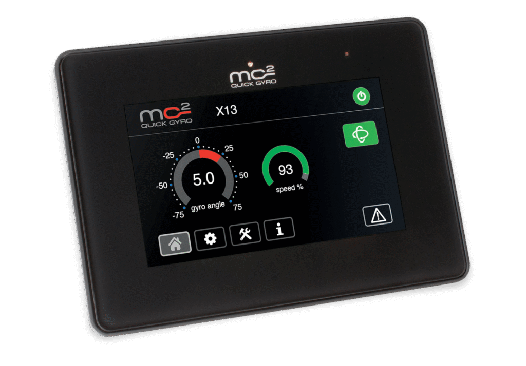 Os estabilizadores MC² são gerenciados por um painel remoto com display gráfico de 5”. Nele, é possível monitorar o desbloqueio de precessão, a velocidade RPM e a inclinação. O painel inclui alertas de manutenção, alarmes de falha e opções de configuração.